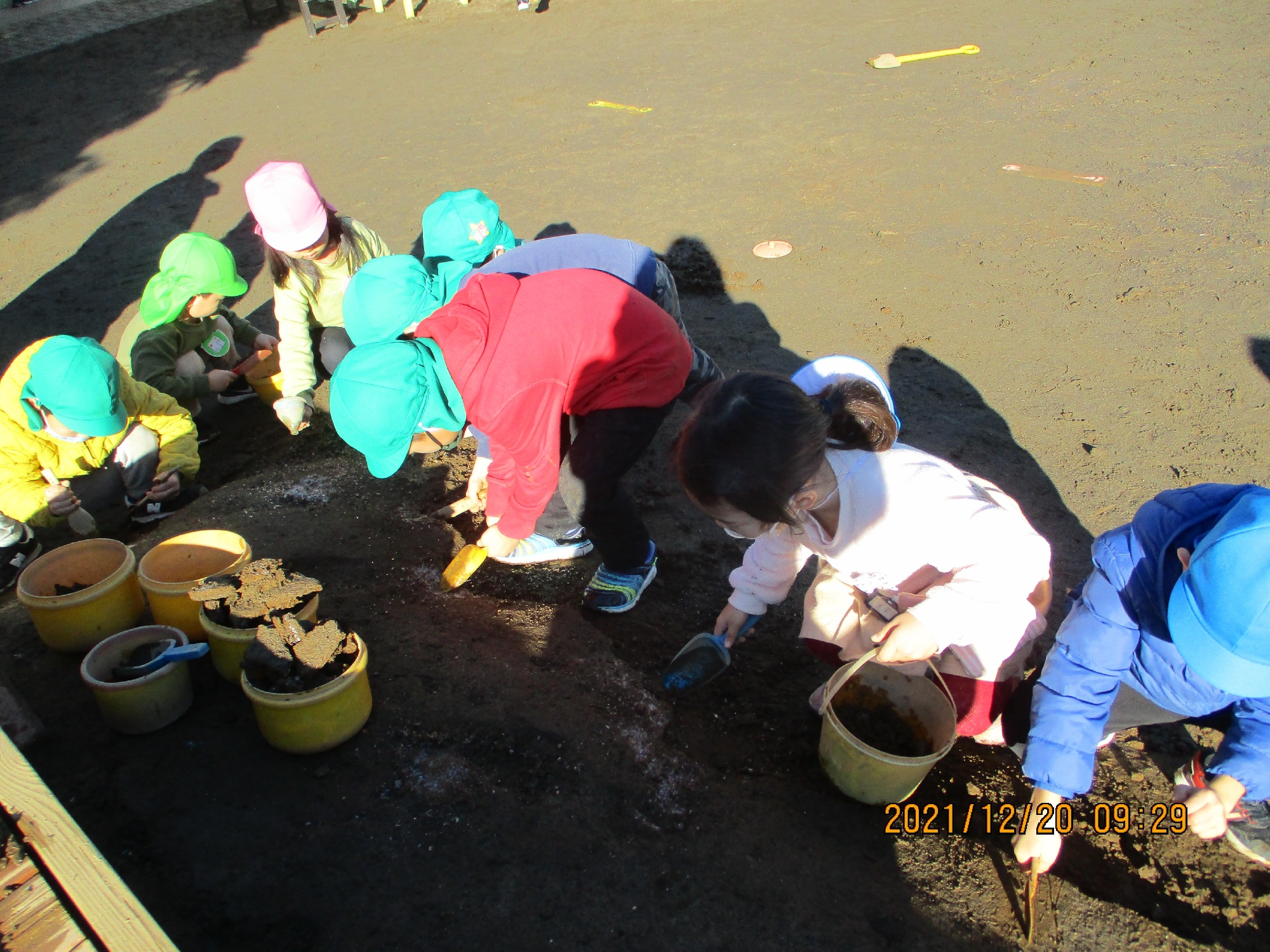 「冷たーい!」と言いながら霜柱を発見して、掘るのに夢中な子ども達です。