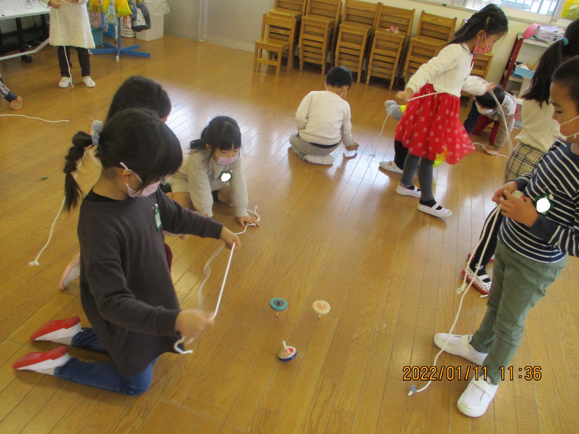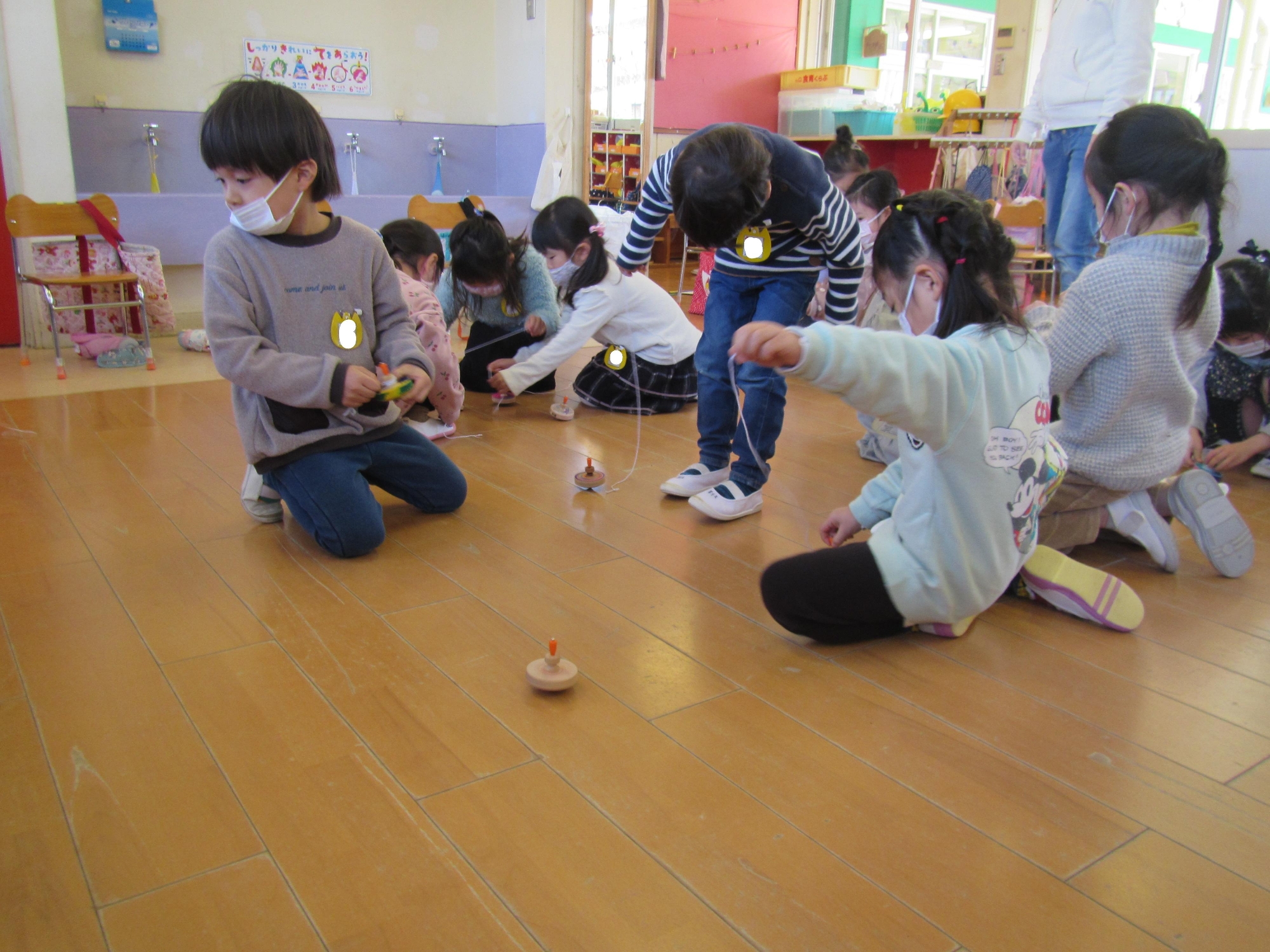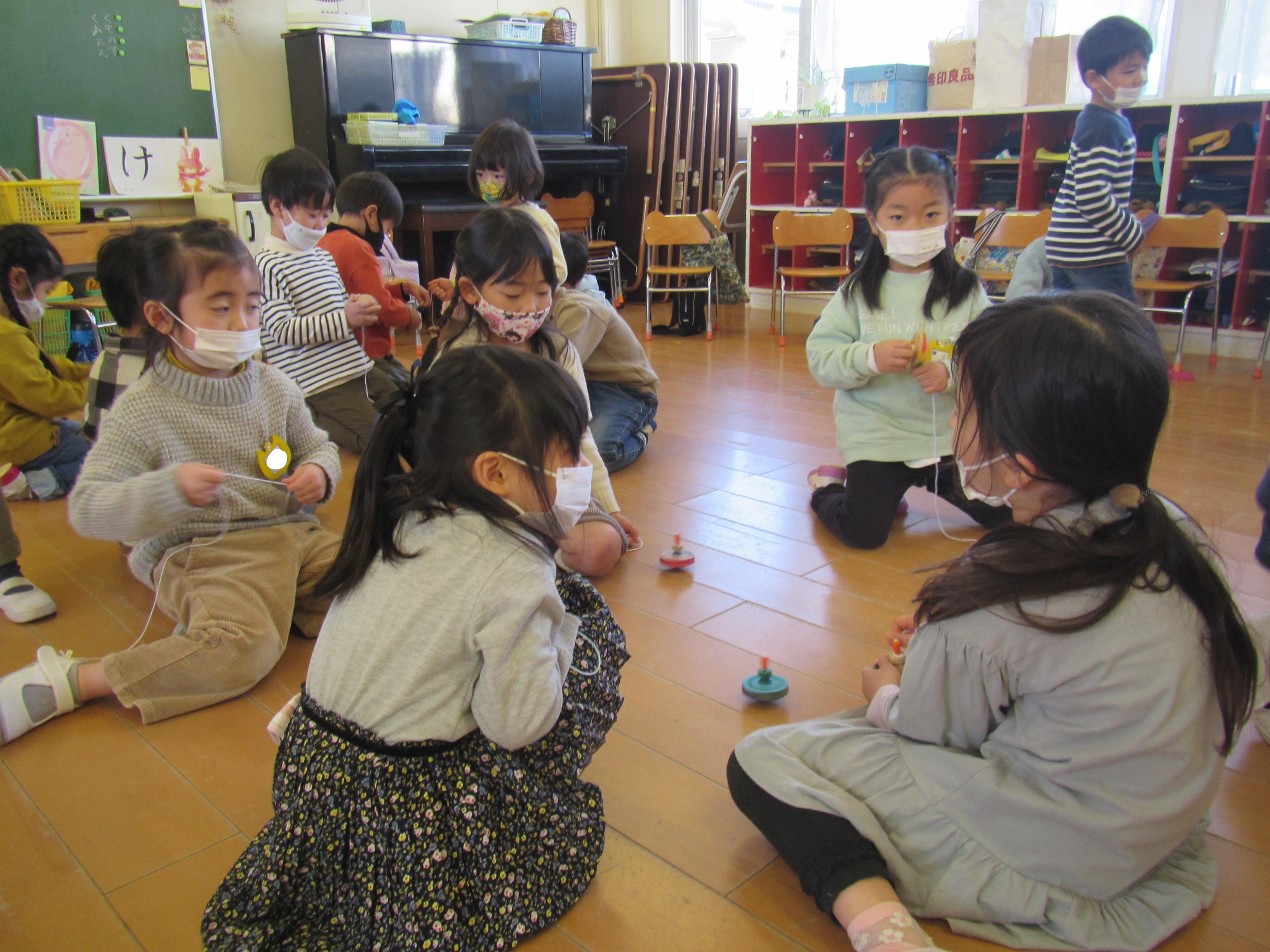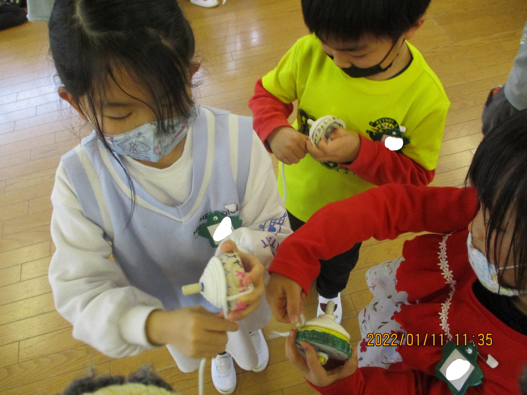 幼稚園に持ってくると、自分のコマを紹介したり、友達のコマの回っている様子を見て「きれいだね」と話している様子が見られましたよ(^^)