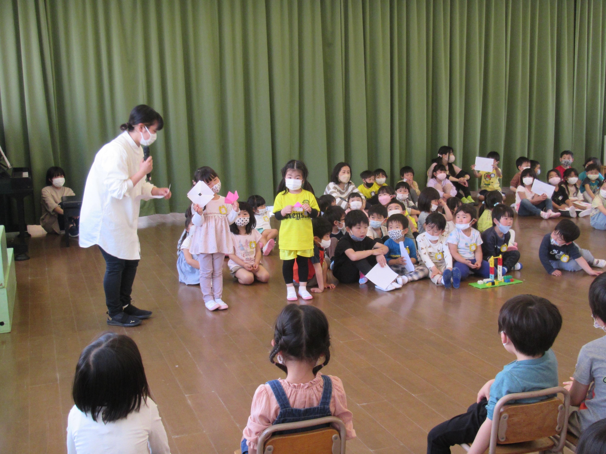 年中組からは自分たちで折った折り紙や描いた絵、ブロック、積み木などを見せてくれました!