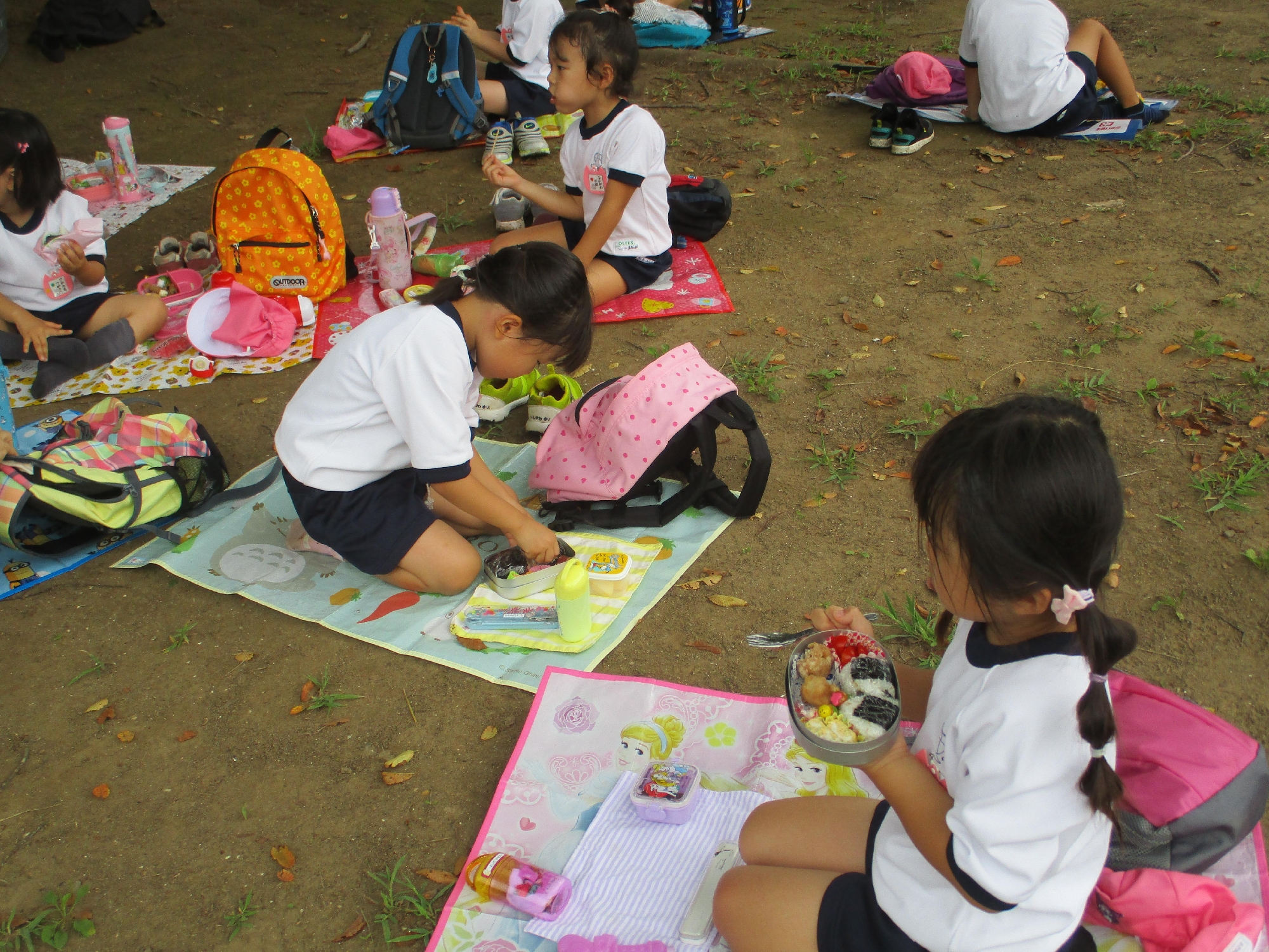 たくさん遊んだので、お腹がペコペコ!「見て~!今日はサンドウィッチ!」など、お家の人が作ってくれたお弁当をみんなで楽しく食べました!いつもとは違う場所で楽しくお弁当が食べる事が出来て、みんな大満足でしたよ。
