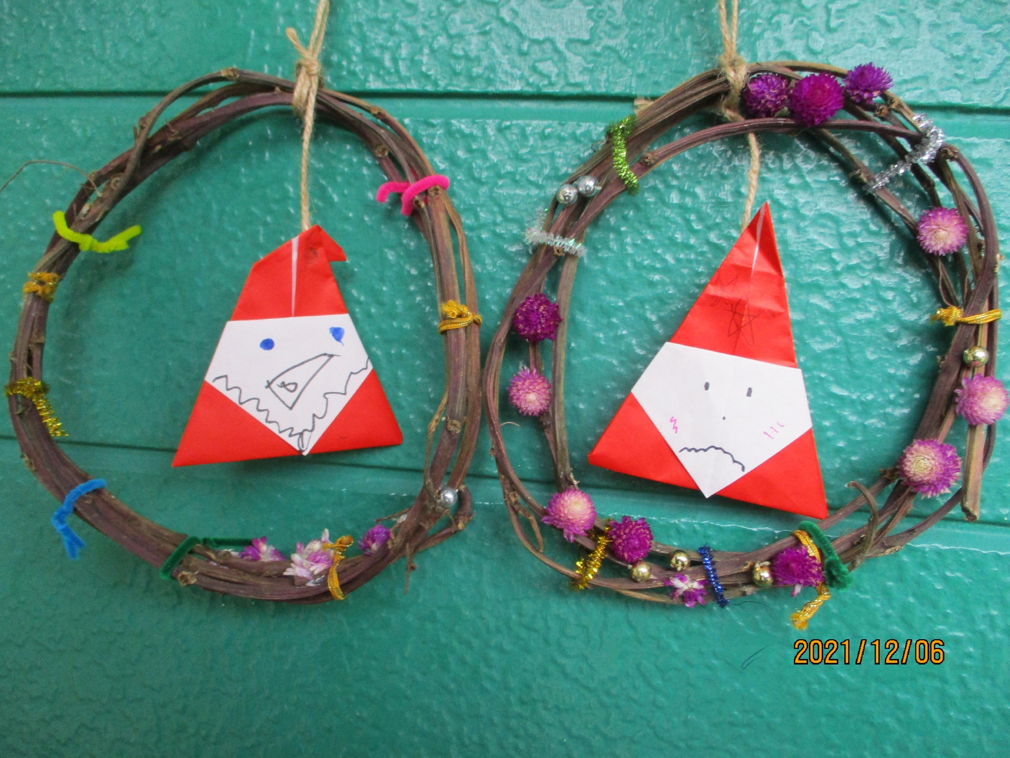 リースの真ん中にサンタさんをぶら下げて、かわいいクリスマスリースができあがりました(^^♪