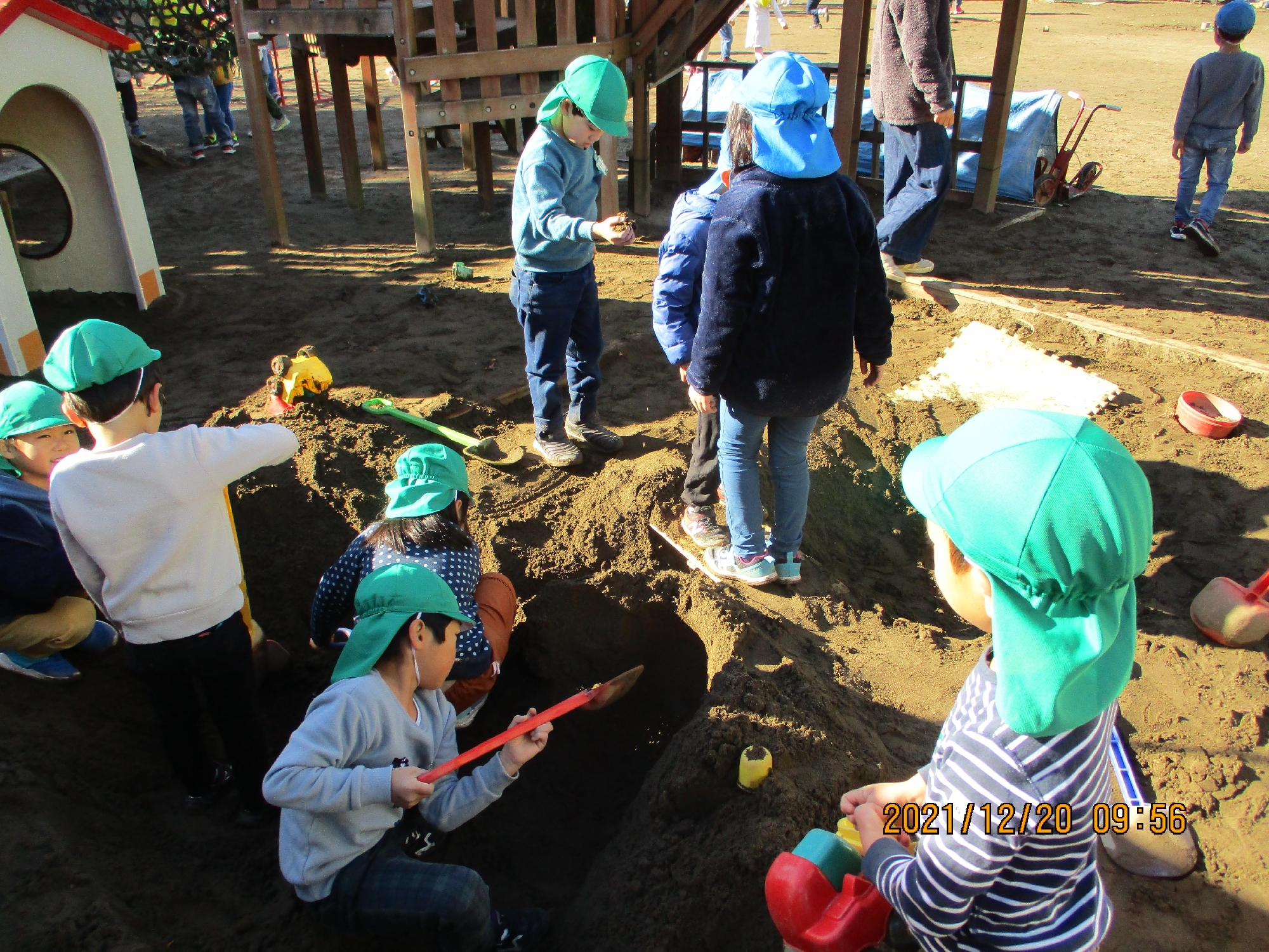 「冷たーい!」と言いながら霜柱を発見して、掘るのに夢中な子ども達です。