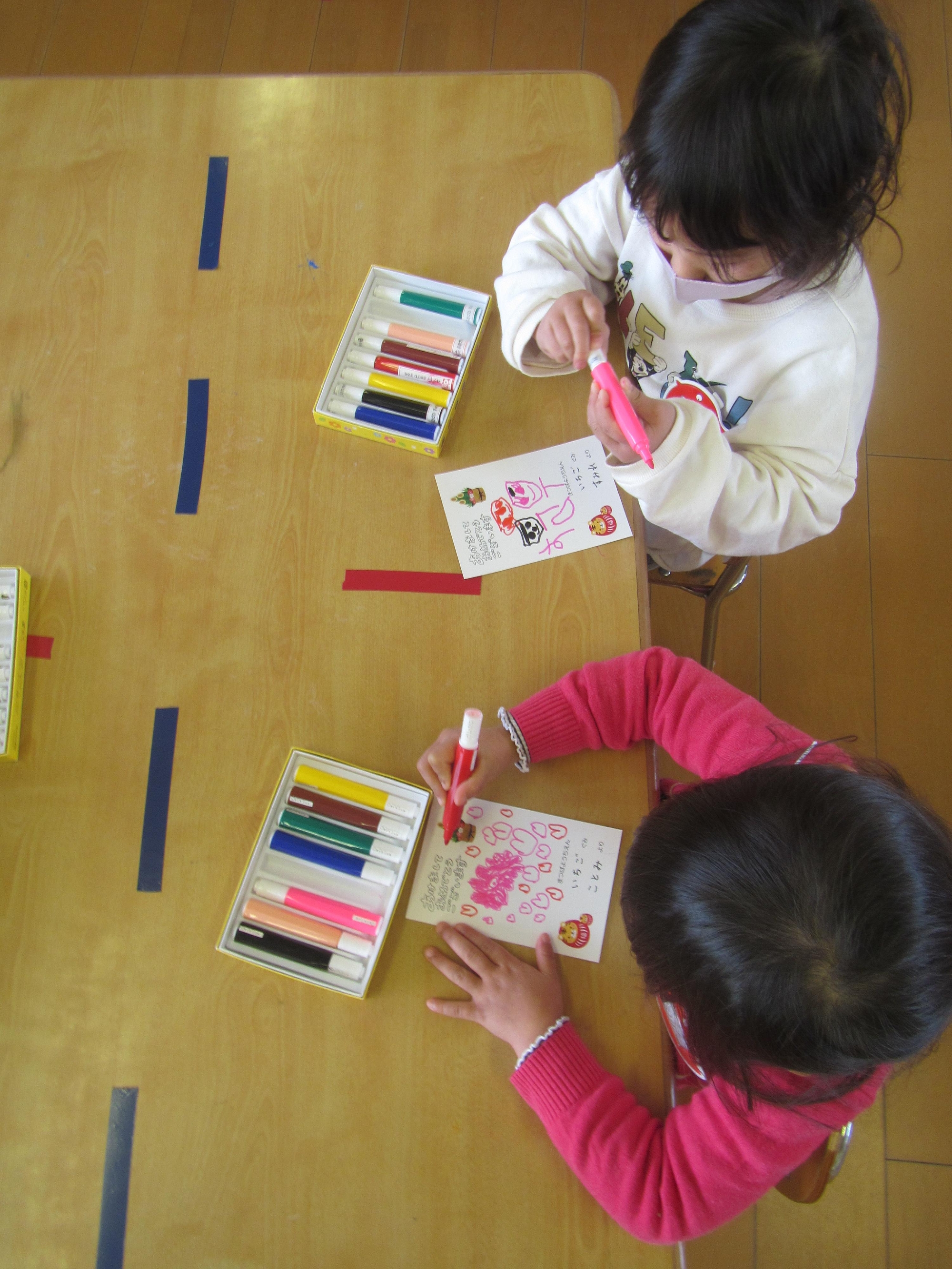 お家の人に向けて「来年も一年よろしくね」と気持ちを込めて、ハガキを書きました。
