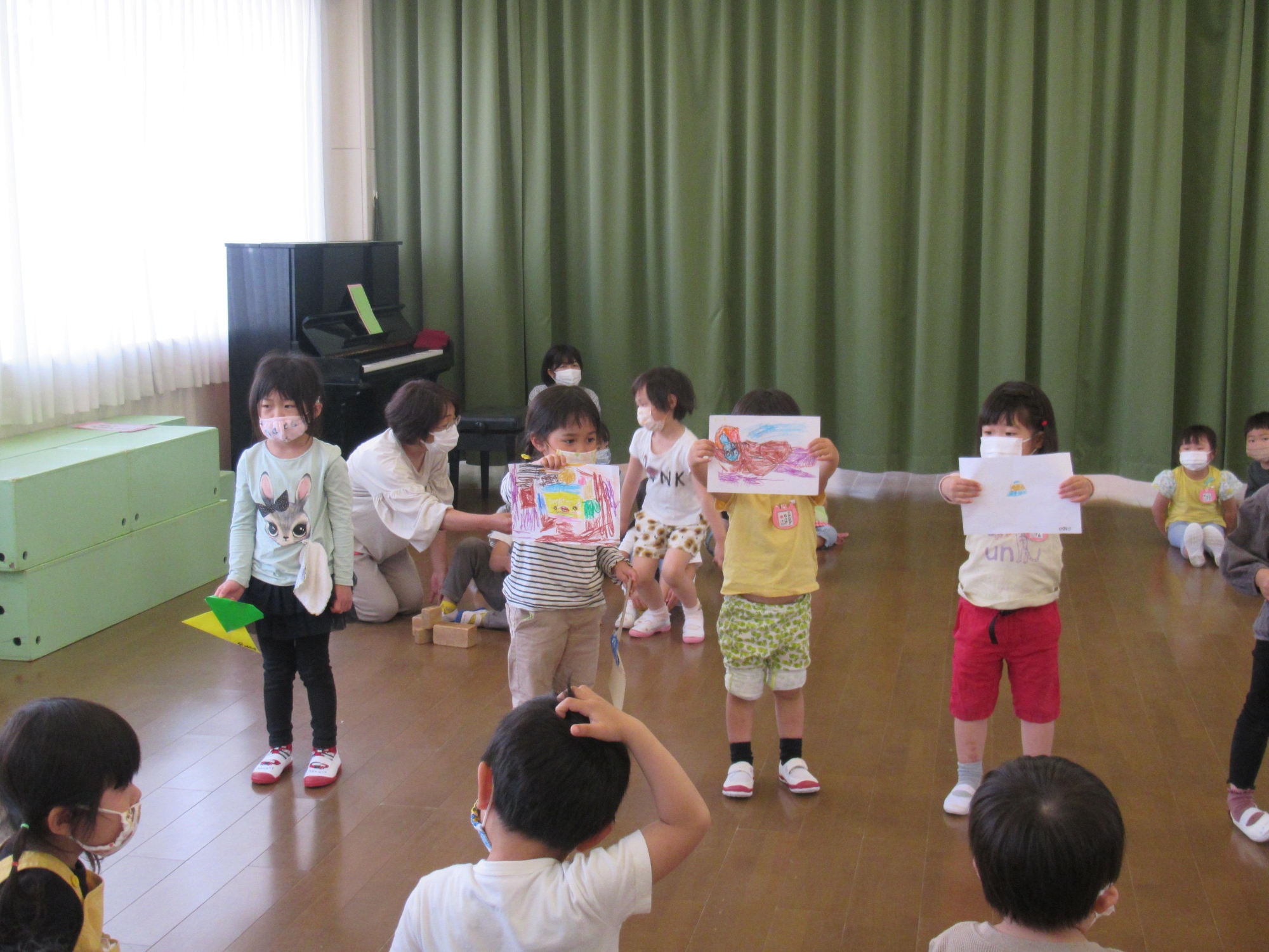 年中組からは自分たちで折った折り紙や描いた絵、ブロック、積み木などを見せてくれました!
