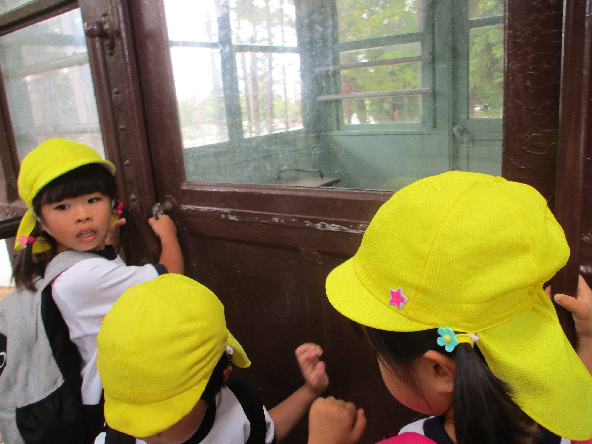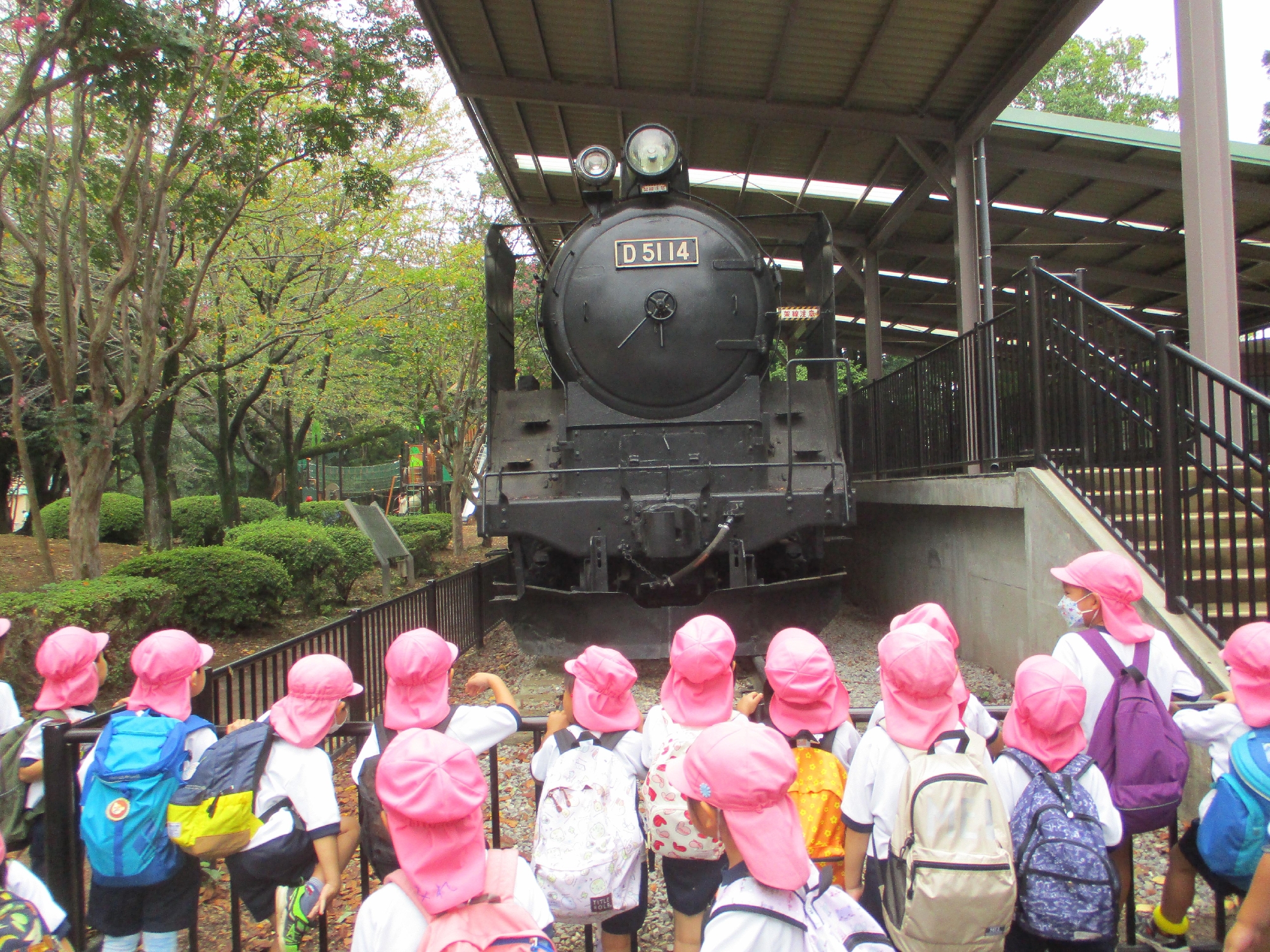 まずは、皆が楽しみにしていたSL(蒸気機関車)。初めて見る子もいて、「大きい!」、「ここが運転手さんが乗るところだよね」とクラスで見た絵本に書いていたことを思い出している様子もありました♪