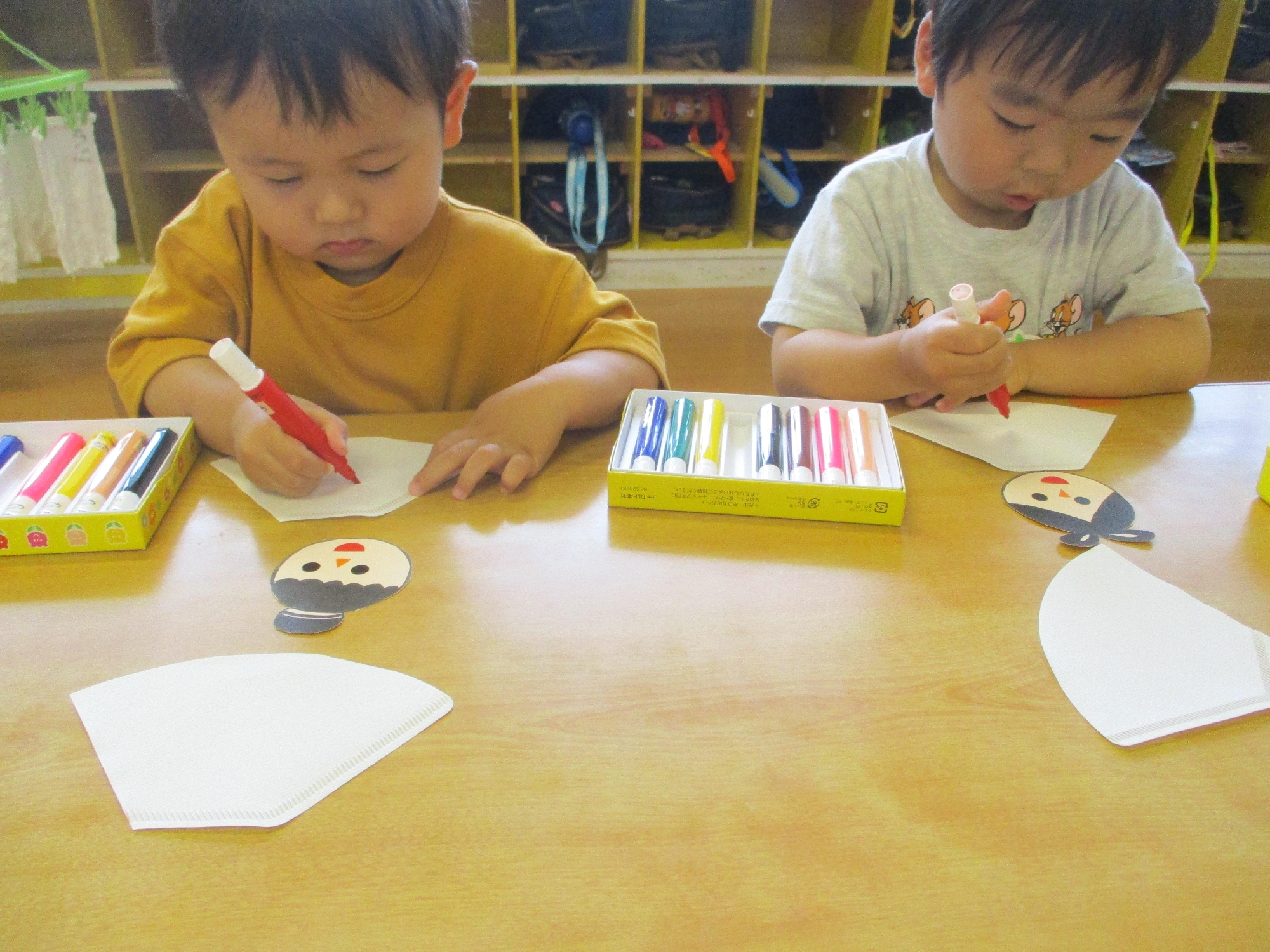 織姫と彦星の顔はシールで目と鼻と口をつけました。着物は、コーヒーフィルターにマーカーで好きな模様を描いて・・・